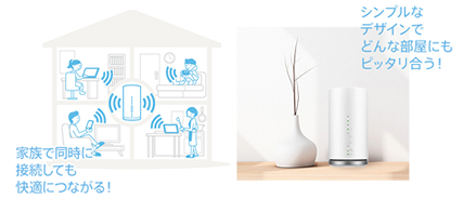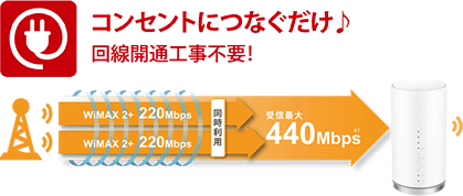 WIMAX2+における4?4MIMO CA通信に対応。下り最大440Mbpsの高速インターネット通信が楽しめる。届いたその日にコンセントにつなげば、すぐに高速インターネットアクセスが可能です。屋内工事の立ち合いも必要ありません。