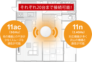2.4G/5GhzのWi-Fi同時利用が可能で、それぞれ20台まで接続できます。(合計40台)Wi-Fiだけではなく、有線LANポート(Gigabitイーサ対応)も2つ搭載。用途に応じた使い方が可能です。