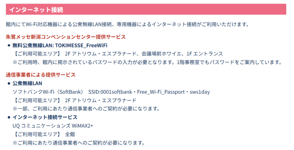 一方で、朱鷺メッセでは有料のプレミアムネットワークサービスが用意されており、公式のネットワーク環境を利用したい場合にはこちらが選択肢になります。より手軽さを重視するなら、法人向けWiFiレンタルを活用する方法も有効です。