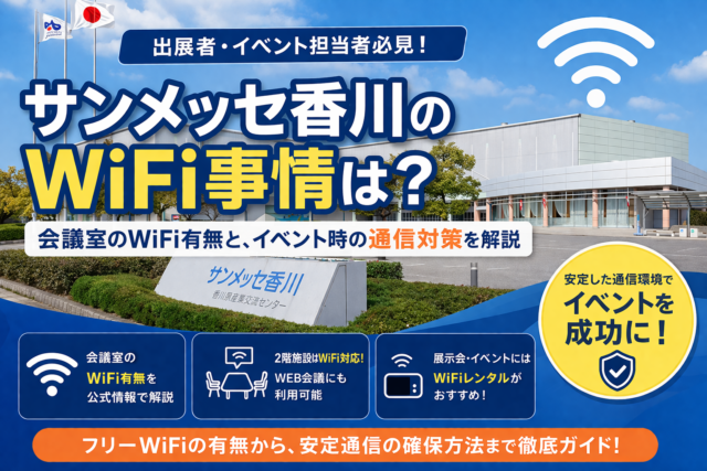 朱鷺メッセには無料WiFiがありますが、利用できるのは主に公共空間であり、展示ホールや展示控室、会議室内では無料WiFiは使えません。実際に出展や運営で通信が必要になる場所を考えると、無料WiFiだけで対応するのは難しいケースが多いといえます。