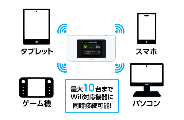 1台のwifiルーターで、スマートフォンやPCなど最大10台接続できます。