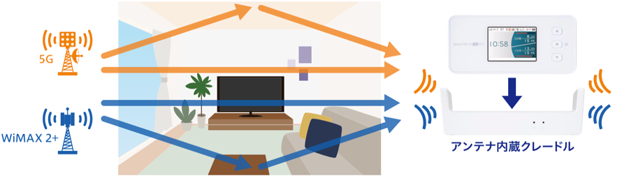 クレードル(オプション品)の両サイドには、5G*9とWiMAX2+対応のアンテナを内蔵。